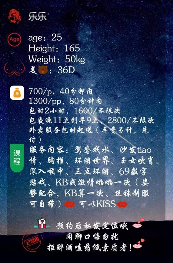 凡是有要求路费/定金/保证金/照片验证/视频验证等任何提前付费的行为,千万不要上当。同时也请注意仙人跳,在寻欢前不要露富和带过于贵重随身物品。本站为分享信息并不对寻欢经历负责,碰到有问题的信息,请及时举报给我们删除信息。