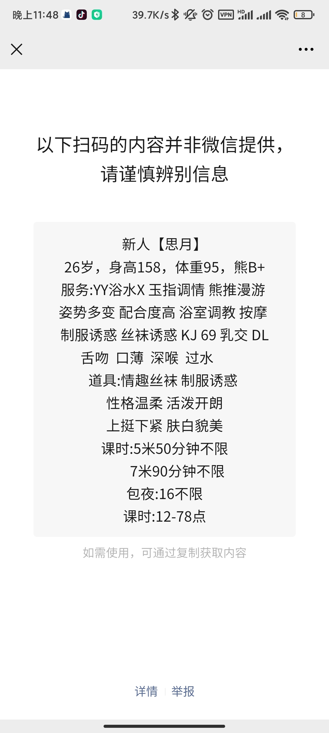 凡是有要求路费/定金/保证金/照片验证/视频验证等任何提前付费的行为,千万不要上当。同时也请注意仙人跳,在寻欢前不要露富和带过于贵重随身物品。本站为分享信息并不对寻欢经历负责,碰到有问题的信息,请及时举报给我们删除信息。