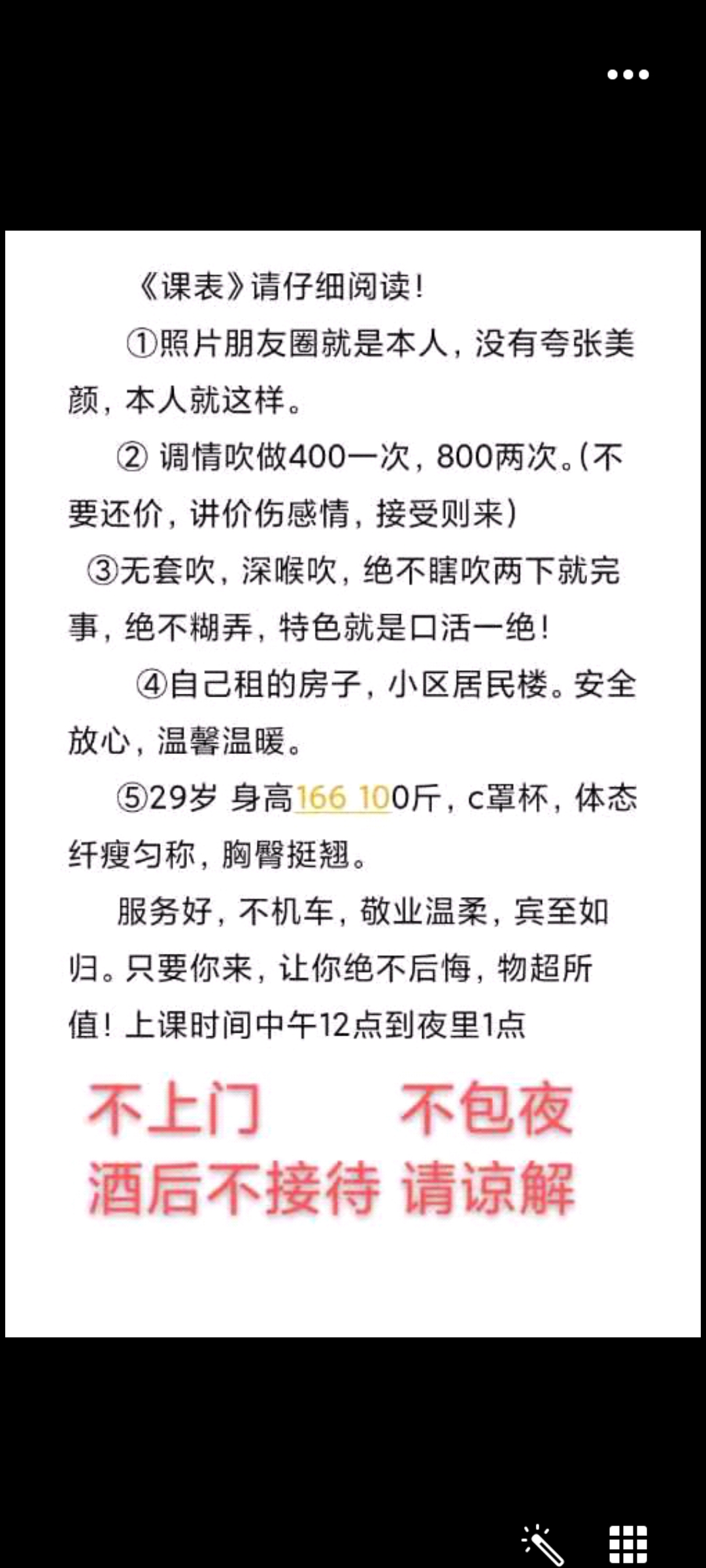凡是有要求路费/定金/保证金/照片验证/视频验证等任何提前付费的行为,千万不要上当。同时也请注意仙人跳,在寻欢前不要露富和带过于贵重随身物品。本站为分享信息并不对寻欢经历负责,碰到有问题的信息,请及时举报给我们删除信息。